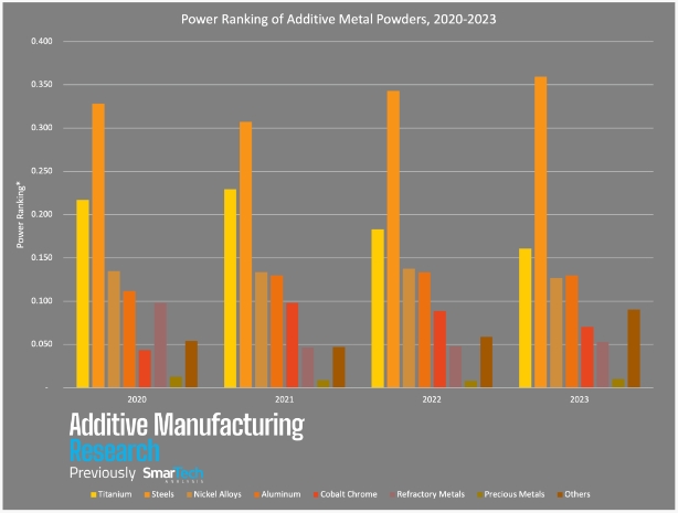 在評估金屬粉末市場時,平衡增長和銷量等因素非常重要。為了正確比較金屬材料對整個3D打印市場的重要性,AMR制定了一套實(shí)力排名的方式,最終將數(shù)據(jù)標(biāo)準(zhǔn)化以進(jìn)行跨年比較。從 AMR 最新的實(shí)力排名圖表中,我們可以發(fā)現(xiàn):